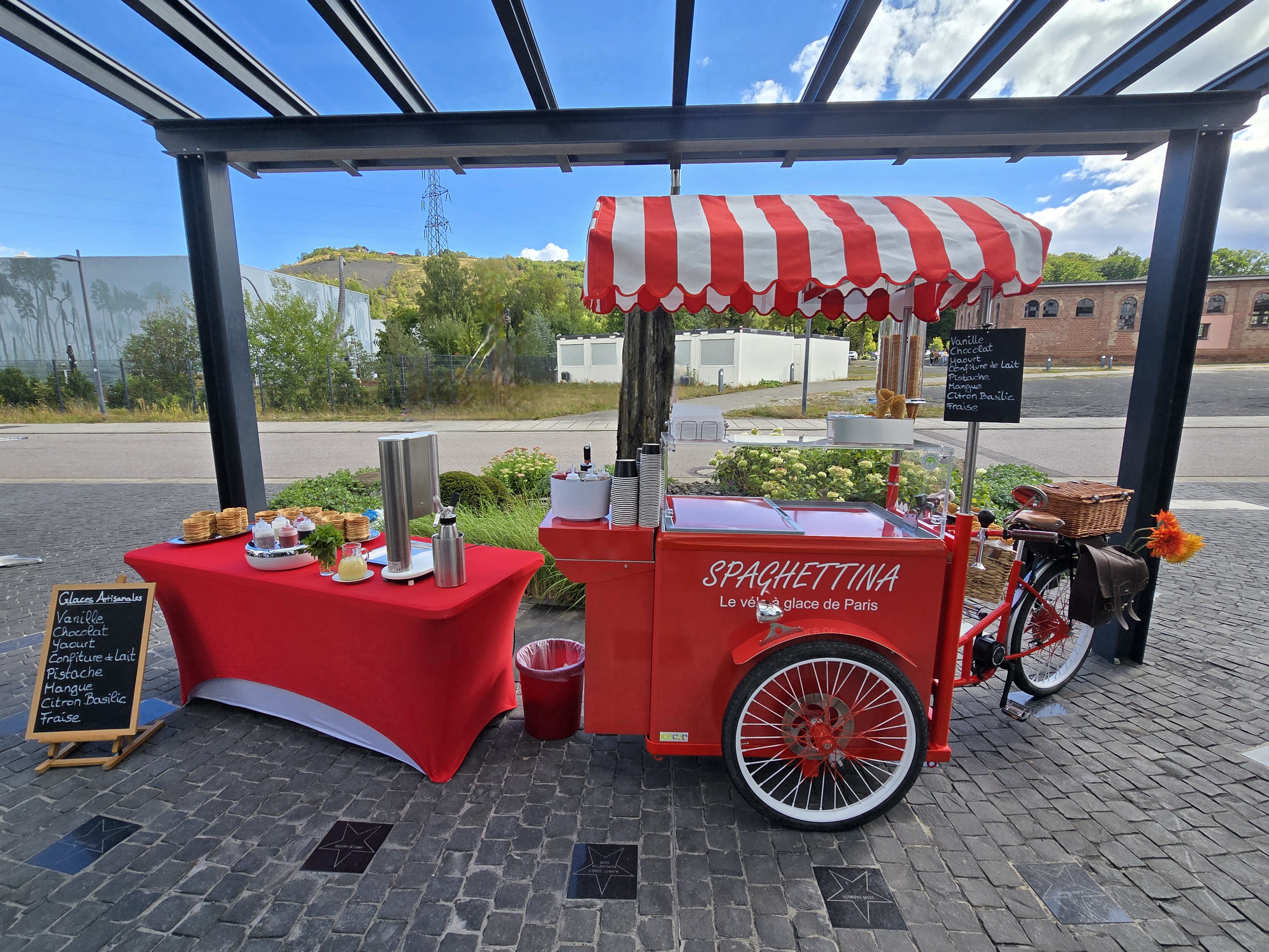 Vous souhaitez déguster des glaces en boules ET des glaces en forme de spaghetti ? Pour répondre à cette demande, nous installons, en plus du vélo à glace, un buffet pour la création de la Spaghettieis sur place. Dans ce cas, l’équipe se compose de 2 personnes.